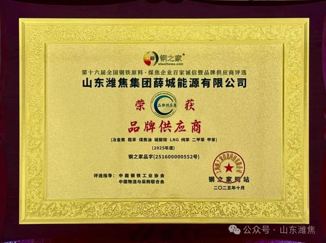 近日,“鋼之家第十六屆全國(guó)鋼鐵原料煤焦企業(yè)百家誠(chéng)信暨品牌供應(yīng)商”評(píng)選活動(dòng)順利舉行,經(jīng)鋼之家網(wǎng)站征信取證,中國(guó)鋼鐵工業(yè)協(xié)會(huì)及中國(guó)物流與采購(gòu)聯(lián)合會(huì)專家綜合評(píng)審,山東濰焦集團(tuán)薛城能源有限公司被評(píng)為2025年度“品牌供應(yīng)商”殊榮。榮譽(yù)證書(shū)